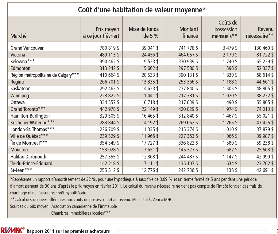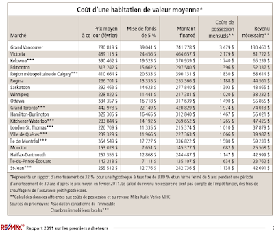 Voici quelques informations intéressantes sur les marchés canadiens, tirées de l’étude REMAX sur les premiers acheteurs 2011. Il est à noter que les premiers acheteurs augmentent leur prix d’entrée dans le marché de la propriété et suivent l’évolution des prix. Le prix d’entrée le plus populaire au Québec se situerait entre 250 000$ et 300 000$. Dans la région du grand Montréal, il se situerait entre 290 000$ et 355 000$.